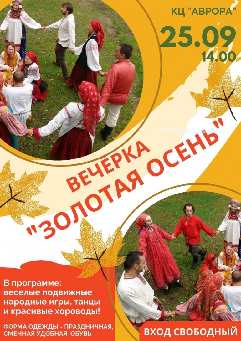 В субботу в 14.00 культурный центр «Аврора» приглашает всех желающих на вечёрку «Золотая осень». Адрес: ул. Жуковского, д. 45. В программе мероприятия народные игры, танцы и хороводы. Приходите в праздничной одежде со сменной удобной обувью, чтобы ничего не отвлекало вас от веселья. Вход свободный. Подробнее тут.