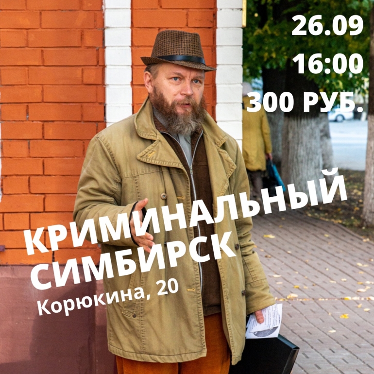 26 сентября (суббота) в 16.00 состоится экскурсия «Криминальный Симбирск» по мотивам анонимного произведения «Шерлок Холмс в Симбирске». Место: ул. Корюкина, д. 20 (Российская академия народного хозяйства и государственной службы при Президенте РФ). Вместе с экскурсоводом Дмитрием Русиным вы ответите на вопросы, зачем Шерлок Холмс приезжал в Симбирск, какие преступления были самыми распространёнными в городе, кто стал жертвой первого ДТП в нем, где были публичные дома и чем рисковали их обитатели и клиенты и т. д. Цена: 300 руб. Регистрацию можно пройти здесь.