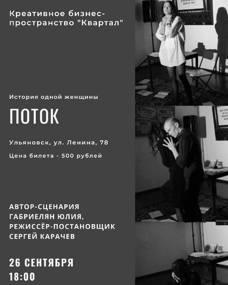 В субботу в 18.00 в креативном пространстве «Квартал» пройдёт показ моноспектакля «Поток» режиссёра Сергея Карачаева. Адрес: ул. Ленина, д. 78. Забронировать билеты можно по здесь. Не забываем средства индивидуальной защиты. Количество мест ограниченно.