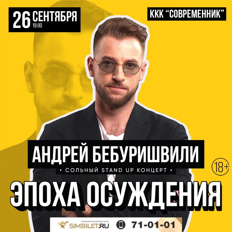 Также в субботу в 19.00 в ККК «Современник» состоится концерт стендапера Андрея Бебуришвили. Адрес: ул. Луначарского, д. 2А. Андрей Бебуришвили – резидент шоу «Comedy Club», ведущий шоу «Открытый Микрофон» на ТНТ. Стендапер, который заслужил любовь зрителей своеобразным, несколько циничным юмором, оригинальной подачей и мощной харизмой. Стоимость билетов: 1600-3000. Купить билет можно тут.