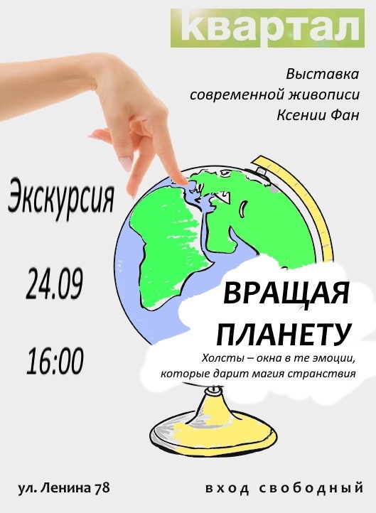 24 сентября (пятница) в 16.00 в креативном пространстве «Квартал» состоится экскурсия-беседа о современной живописи «Вращая планету». Адрес: ул. Ленина, д78. «Вращая планету» — это проект ульяновских мастеров кисти о путешествиях в другие страны и города. В проекте примут участие художники: Ксения Фан, Kakoi-to-frik, Mirango, Den, Оферкина. На открытии выставки вас ждёт экскурсия, фуршет и подарки. Вход — свободный! Зарегистрироваться и узнать подробности можно здесь.