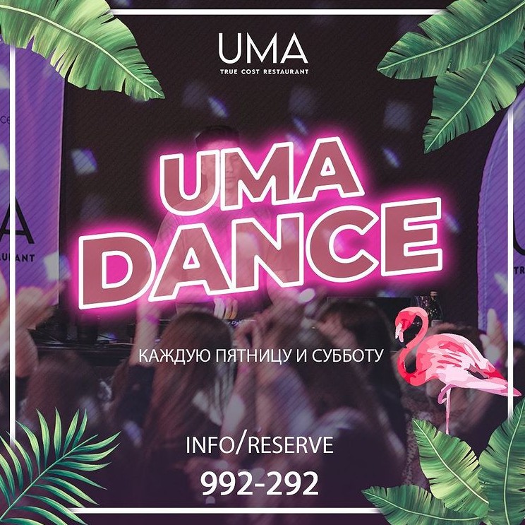 Каждую пятницу и субботу у вас есть прекрасная возможность посетить вечеринку я в ресторане UMA. Адрес: ул. Московское шоссе, д. 100Б. Получить дополнительную информацию и зарезервировать столик можно по номеру: 992-292.