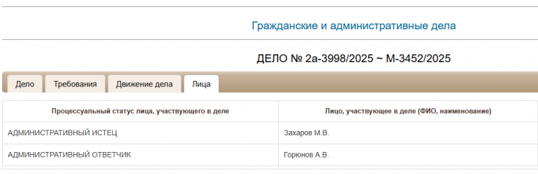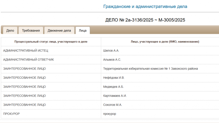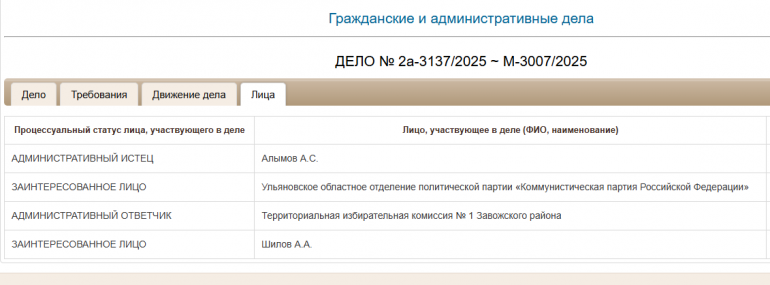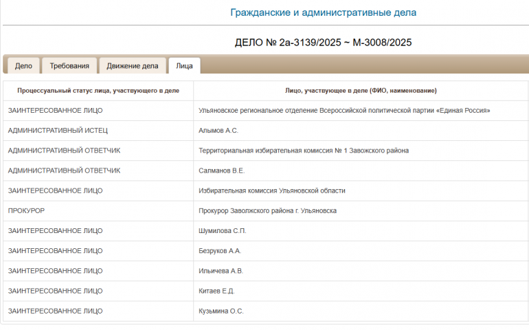 Среди заинтересованных лиц реготделение партии «Единая Россия», коммунист Евгений Китаев, а также некие Безруков, Ильичева, Кузьмина и Шумилова.