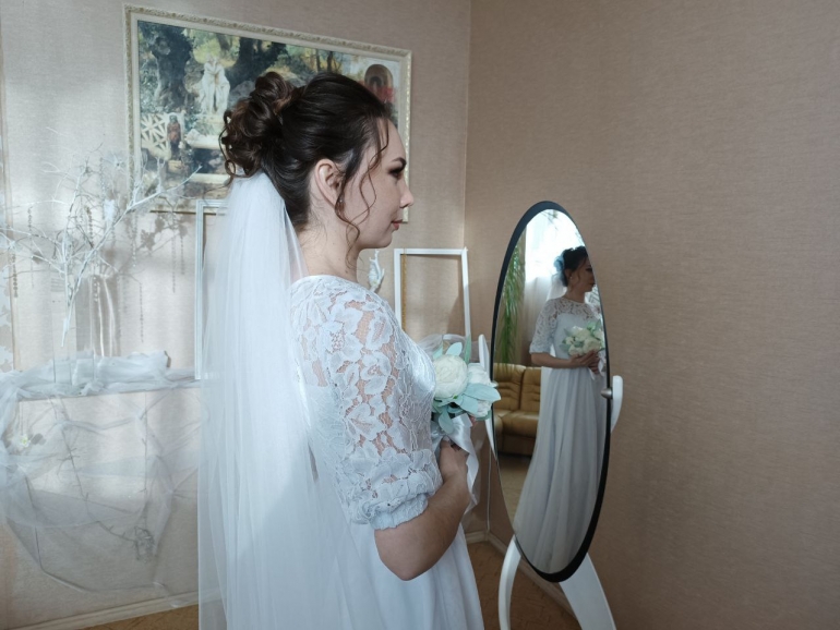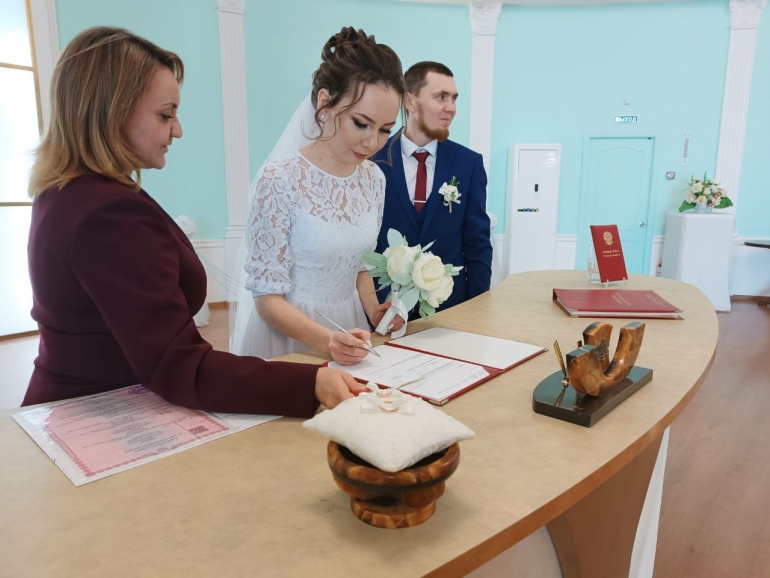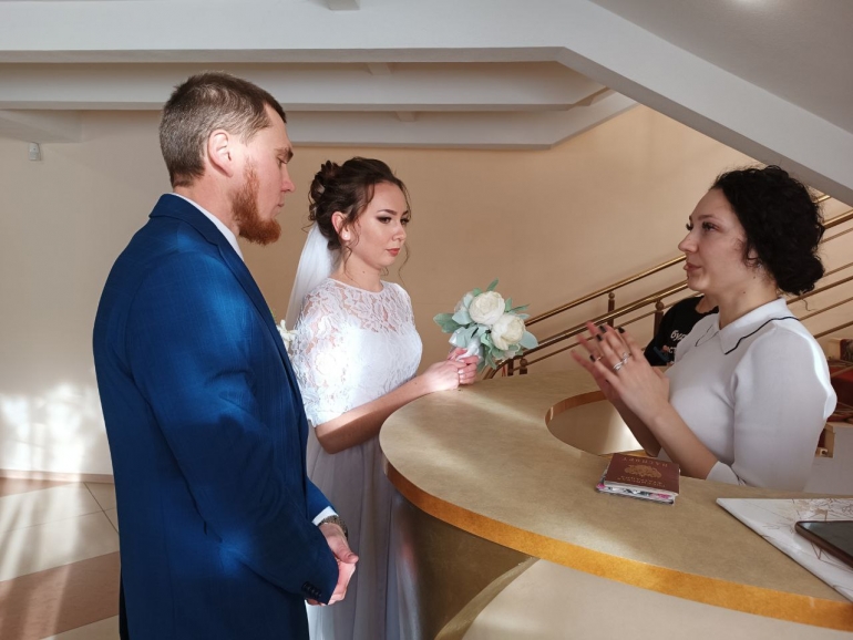 В ЗАГС Заволжского района жених и невеста приехали, как положено, в разных машинах. Артем - в строгом темно-синем костюме, Ангелина - в белом воздушном платье с фатой. Перед торжественной церемонией бракосочетания получили ценные указания и расписались в специальном журнале.