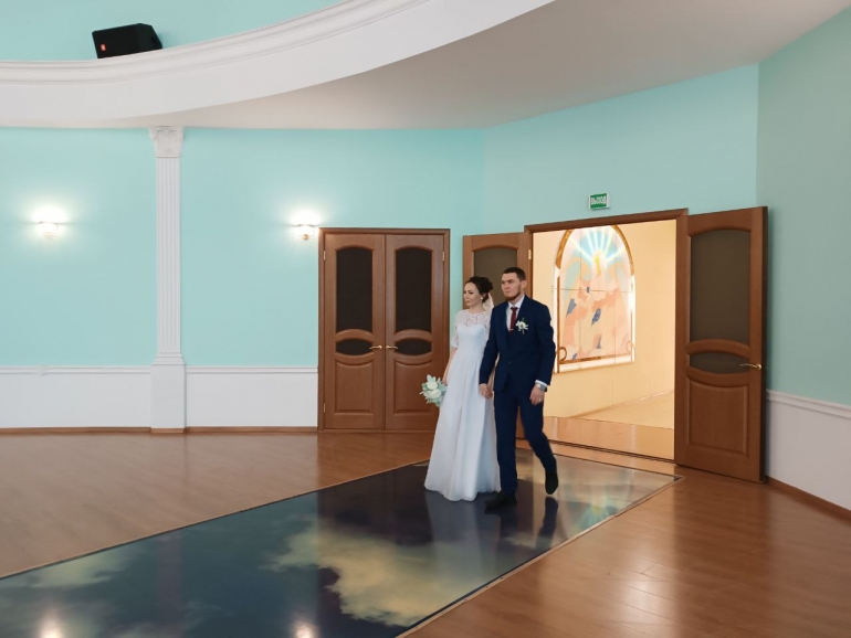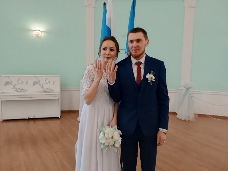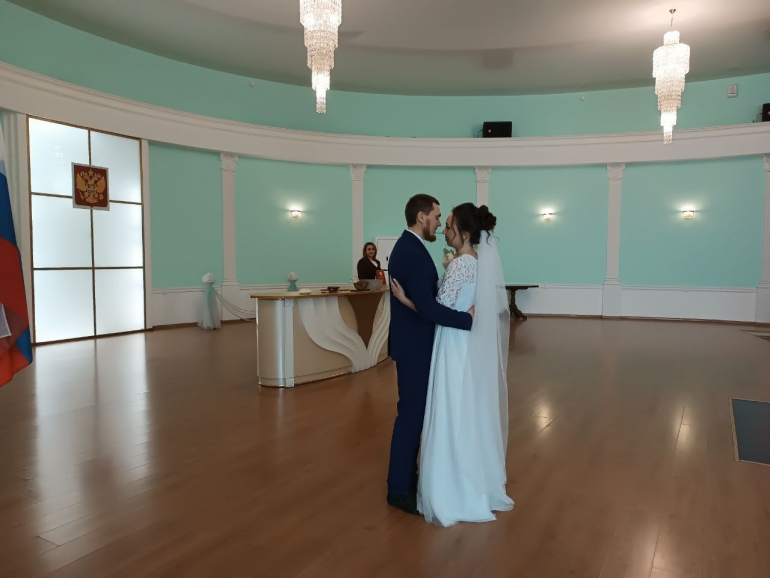 В зал бракосочетания молодые люди зашли после гостей. После торжественной речи сотрудницы ЗАГСа, скрепили подписями журнал получения свидетельства о браке, обменялись кольцами, исполнили первый брачный танец и получили первый семейный документ.