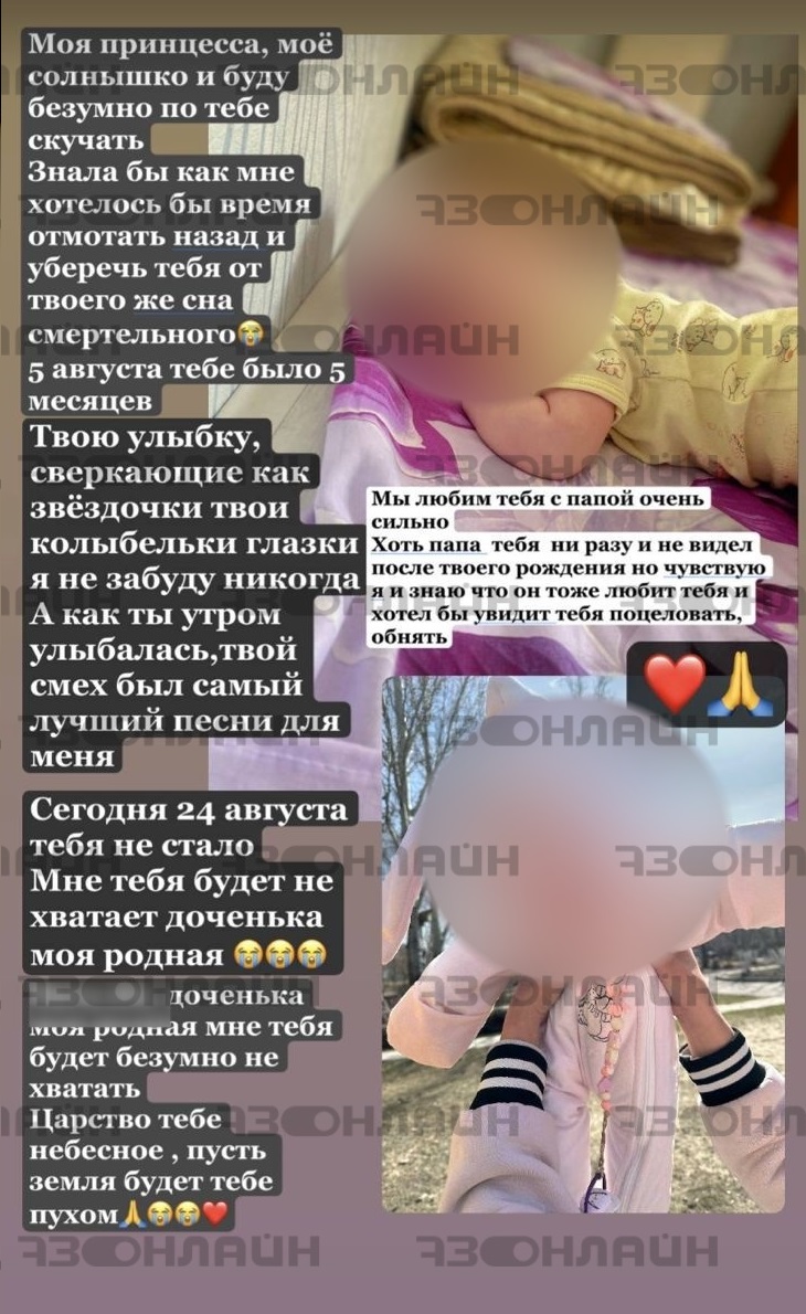 По версии Ангелины, которую она озвучила в своих соцсетях, девочка скончалась от синдрома внезапной детской смерти (СВДС). «Твою улыбку, сверкающие как звёздочки твоей колыбельки глазки я не забуду никогда», — пишет она.