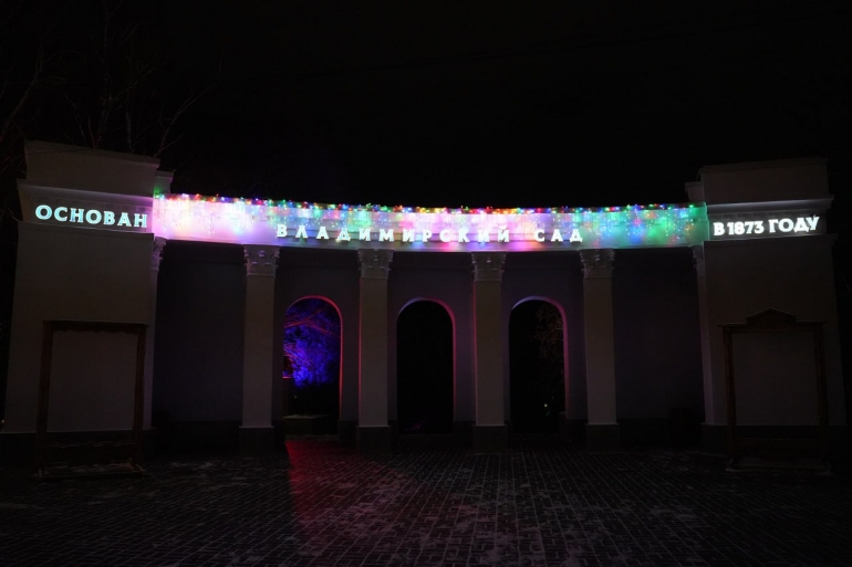 Разноцветную гирлянду повесили на входную группу «Владимирского сада».