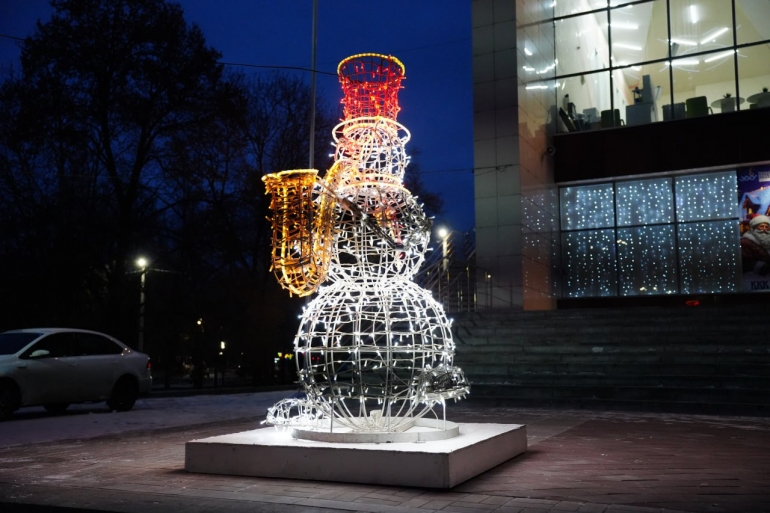 Дополнительно площадь украсили световыми декоративными конструкциями. Там выставлены пять световых фигур «Подарки» и «Новогодние шишки».
