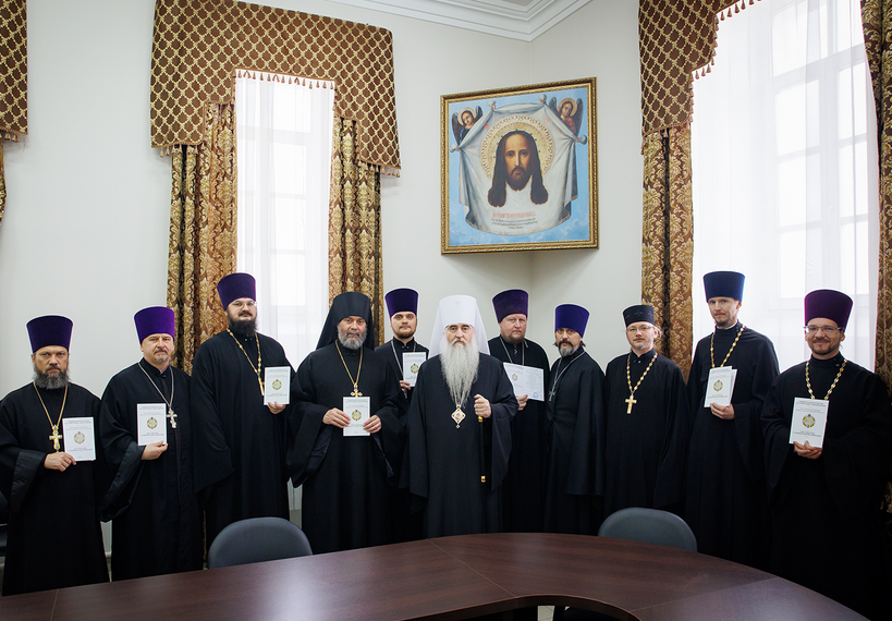 Аттестационную комиссию возглавил Митрополит Симбирский и Новоспасский Лонгин. Он вручил удостоверения священникам, завершившим обучение на курсах и успешно прошедшим аттестацию.