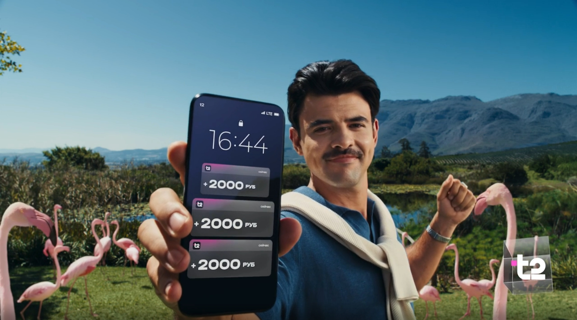 В серии рекламных роликов Т2 решила наглядно продемонстрировать предвкушение выгоды. Это ощущение бренд выразил через отдых на берегу океана и беззаботный танец в компании друзей. Изюминкой этих мечтаний стали экзотические животные. Абонент Виктория проводит время с роскошным ручным гепардом, а герой второго ролика Аркадий танцует в окружении ярких фламинго. Однако героям, как и абонентам оператора, не приходится просто мечтать – их ждет реальная выгода, которую можно получить, приводя друзей в Т2.