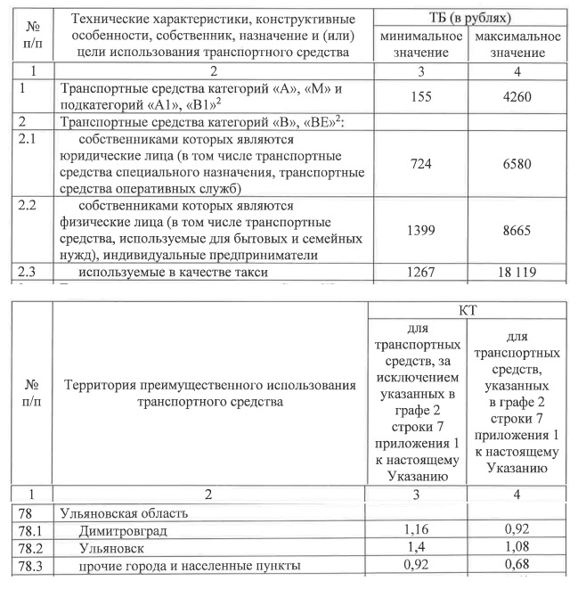 Ульяновская область последние несколько лет находится в так называемом красном поясе, и нашего региона изменения в КТ не коснулись. Для Ульяновска по-прежнему действует показатель 1,4, для Димитровграда — 1,16, для всего остального региона — 0,92. Для машин такси КТ меньше: Ульяновск — 1,08, Димитровград — 0,92, прочие населенные пункты — 0,68.