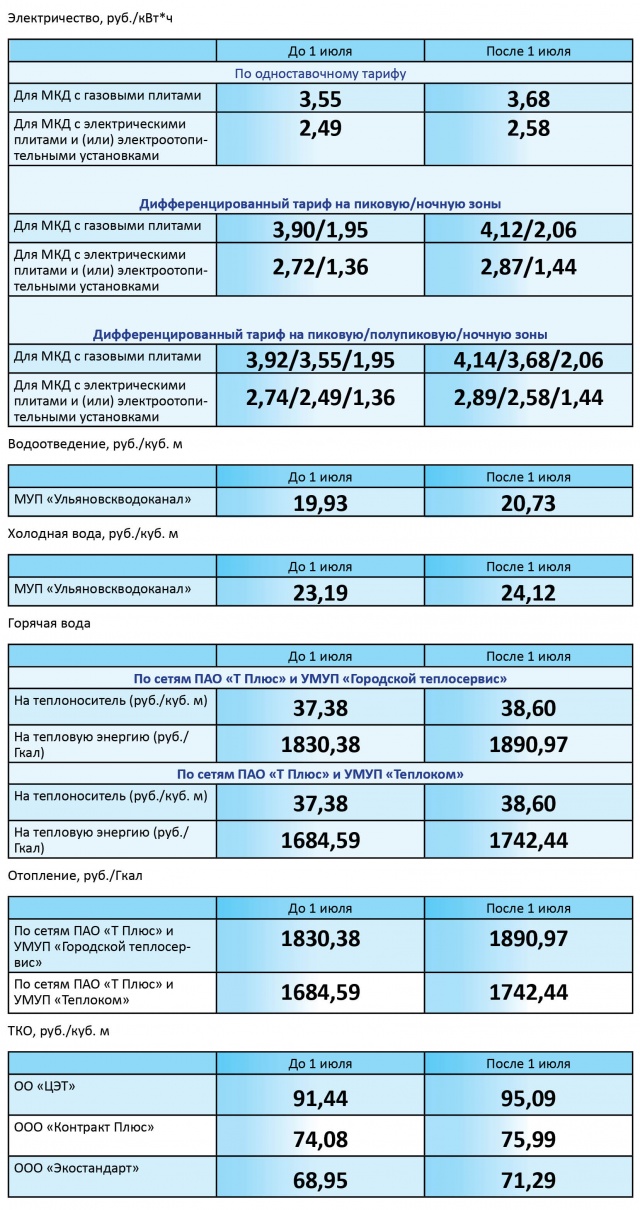 Информация о стоимости коммунальных услуг размещена в открытом доступе. По указанным расценкам вы уже можете оценить, насколько вырастет ваша квартплата в следующем месяце. Так, например, стоимость электричества с 1 июля увеличится на 3,66%. В денежном выражении это означает, что для обитателей квартир с газовыми плитами она вместо 3,55 рублей станет 3,68 рублей за килоВатт в час. А для домов с электрическими плитами вместо 2,49 рублей - 2,58 руб./кВтч. Цена за холодную воду в среднем возрастет на 4% – до 24,12 рублей за кубический метр. Водоотведение также подорожает на 4% и составит 20,73 рублей за куб.