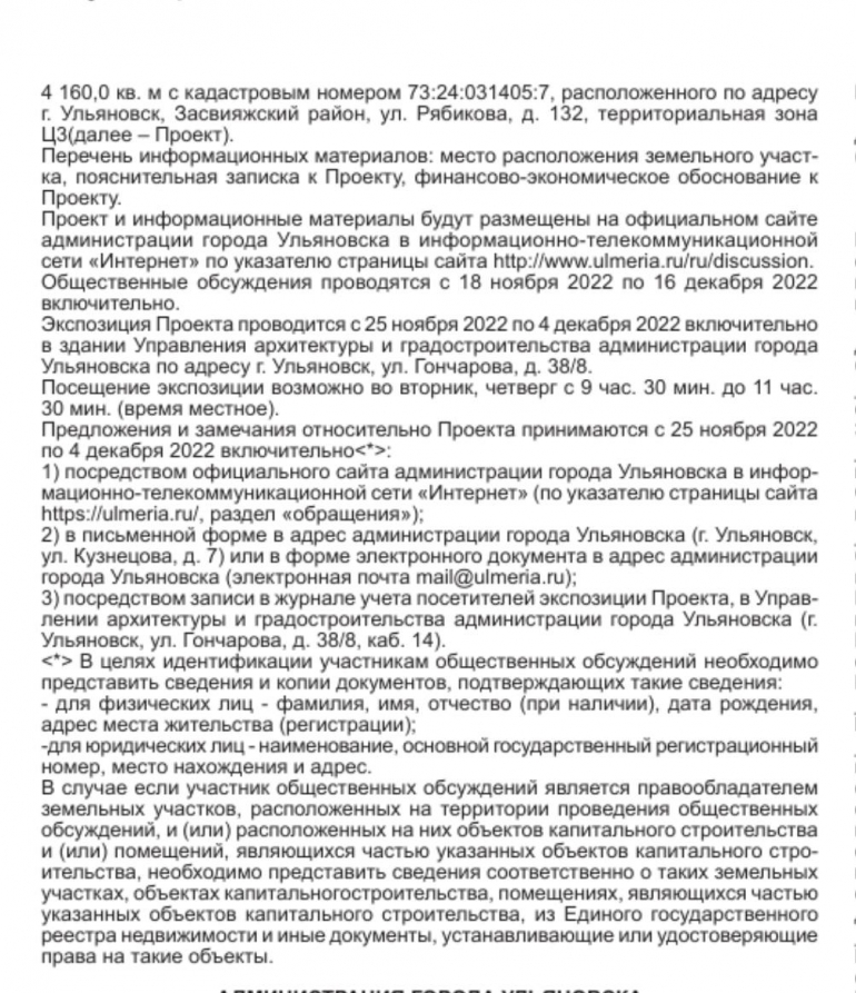 Обсуждения проводятся с 18 ноября по 16 декабря включительно. Экспозиция будет проводиться с 25 ноября по 4 декабря в здании Управления архитектуры и градостроительства мэрии по адресу: ул. Гончарова, 38/8. Посетителей будут пускать по вторникам и четвергам с 09.30 до 11.30 по местному времени.