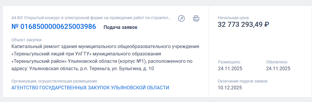 На портале ЕИС «Закупки» началась подача заявок на капитальный ремонт первого корпуса Тереньгульского лицея при УлГТУ — стоимость оценили в 32,7 млн рублей, подача заявок продлится до 10 декабря.