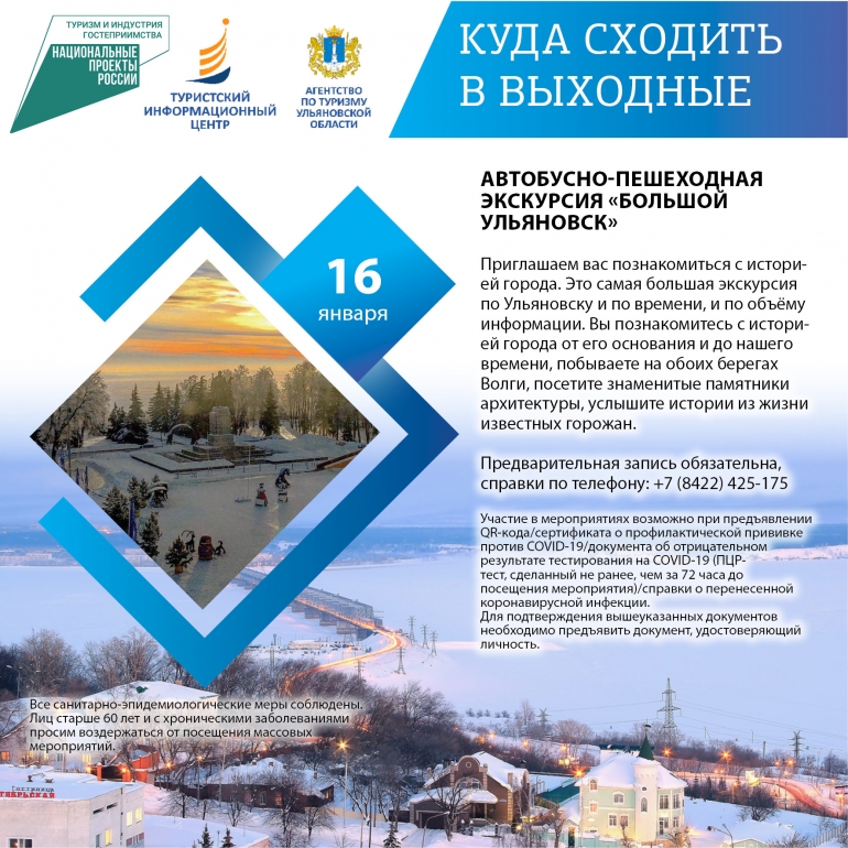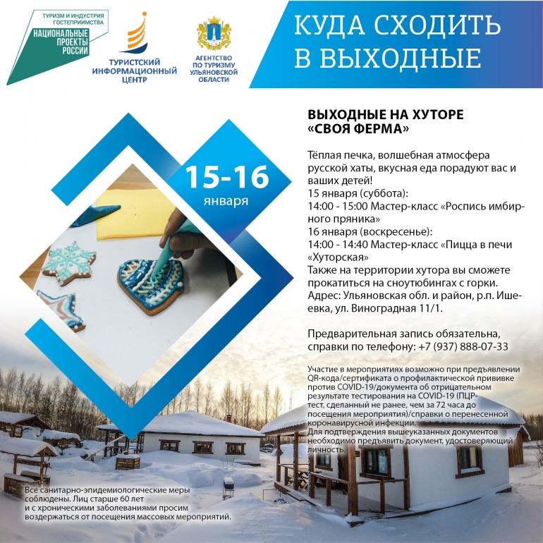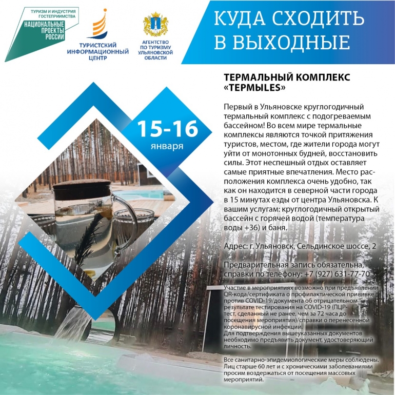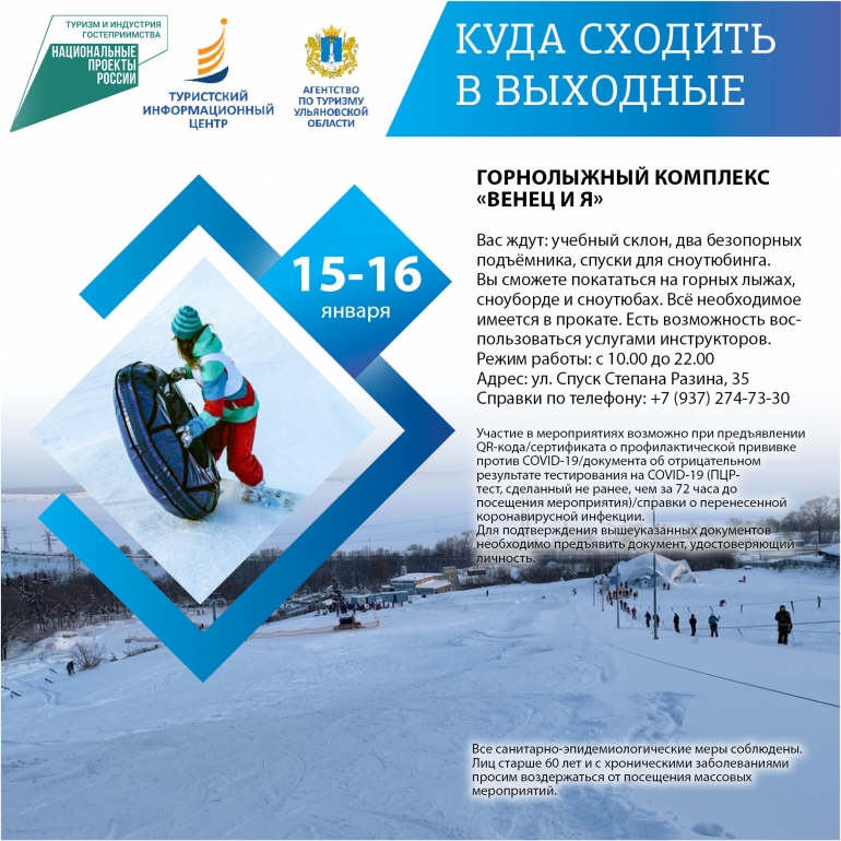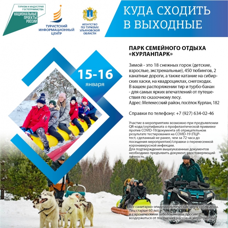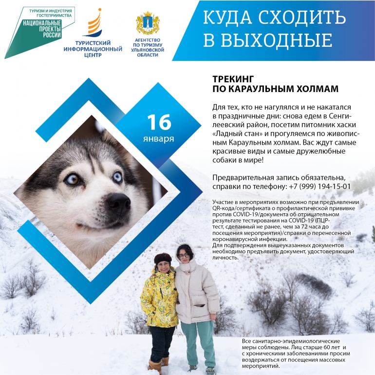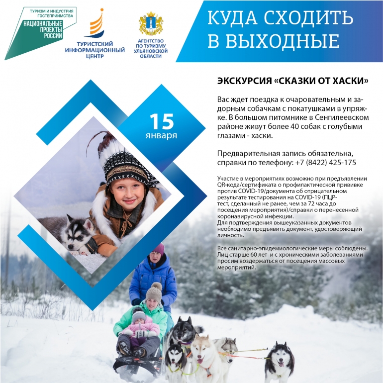 Сегодня суббота, а значит пришло время хорошенько отдохнуть. По этому случаю 73online.ru публикует традиционную подборку мероприятий для вашего выходного досуга от Агентства по туризму Ульяновской области. Отправьтесь к очаровательным хаскам, прокатитесь на горных лыжах или сноуборде, испытайте полный релакс в термокомплексе или погуляйте по Караульным холмам. Напомним, что участие в экскурсиях и вход в музеи возможны при предъявлении QR-кода или отрицательного ПЦР-теста.