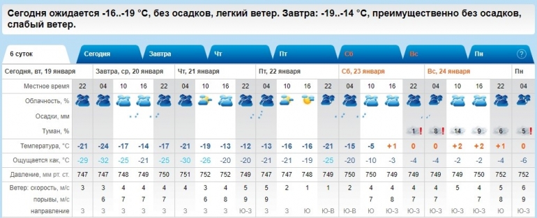 По данным Ульяновского гидрометеоцентра в ночь с 19 на 20 января и утром 20 января 2021 года на территории Ульяновской области ожидается понижение температуры воздуха от -22°C до -27°C, в городе Ульяновске до -25°C, местами небольшой снег. Днём температура воздуха по области от -14°C до -19°C, по городу Ульяновску до -18°C.