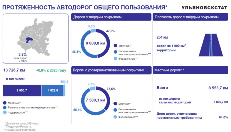 По информации аналитиков, общая протяженность дорог местного значения составляет 8 553 км. Большая часть – дороги сельских территорий (6 876 км).