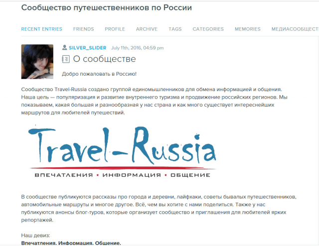 Сообщество Travel-Russia создано группой единомышленников для обмена информацией и общения. Его цель — развитие внутреннего туризма и продвижение российских регионов. Блогеры показывают, какая большая и разнообразная у нас страна и как много существует интереснейших маршрутов для любителей путешествий.