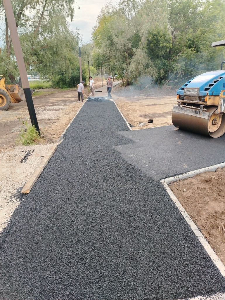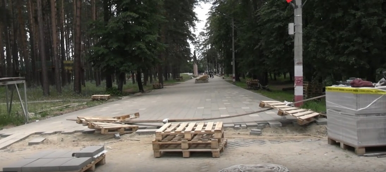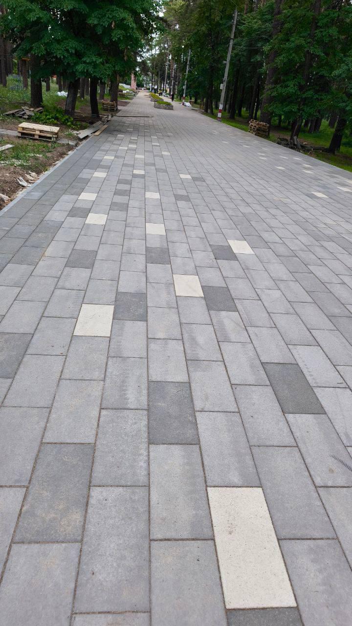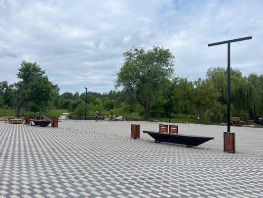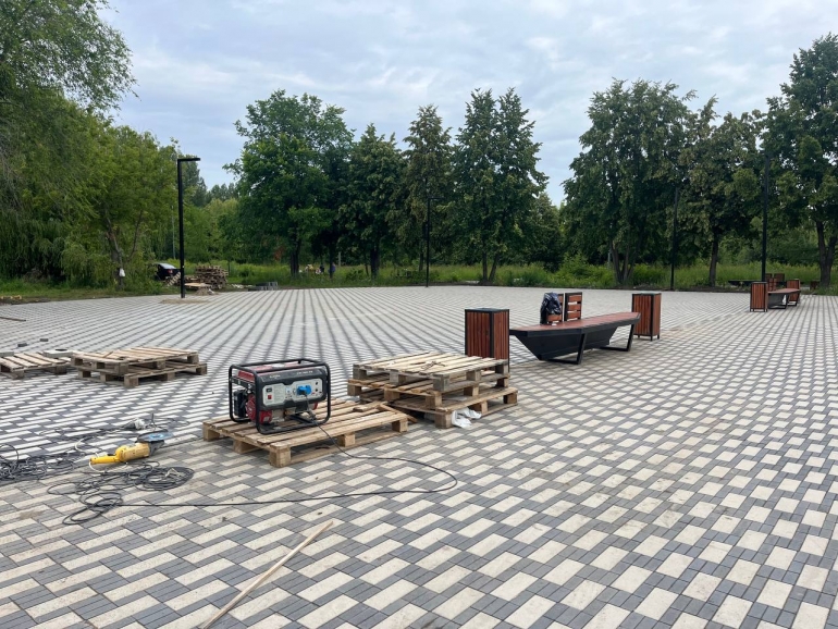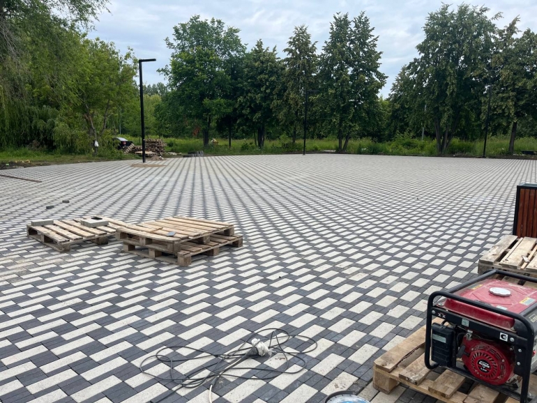 В парке «Западный» установили бордюры, выполнили устройство оснований для пешеходных дорожек, сейчас ведется укладка брусчатки. Далее строители установят игровые и спортивные площадки, скамейки, урны, обновят сцену и освещение.