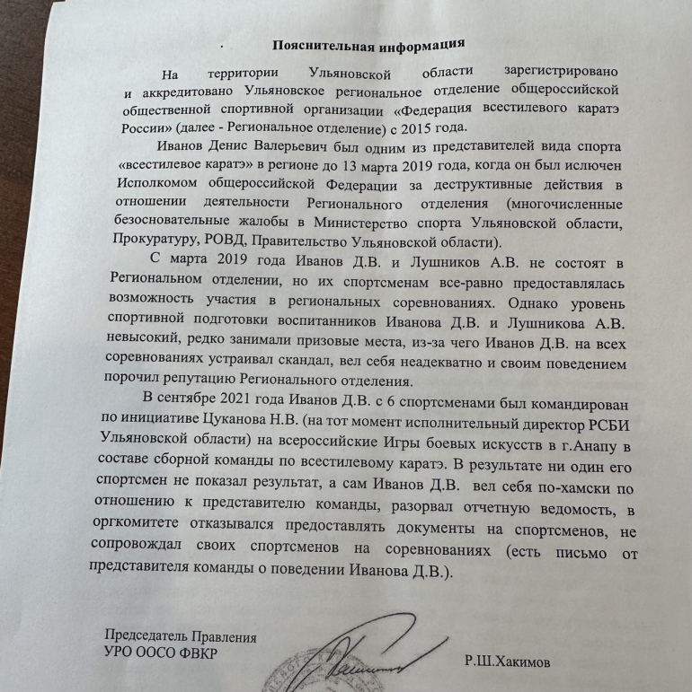 Демешко подкрепляет свои слова пояснительной запиской из Федерации всестилевого каратэ, где говорится, что Иванов и Лушников были отчислены из рядов федерации Исполкомом общероссийской Федерации за деструктивные действия в отношении регионального отделения. Однако им все равно предоставили возможность участвовать в соревнованиях со своими воспитанниками. «Уровень спортивной подготовки воспитанников Иванова был невысокий, они редко занимали призовые места, из-за чего он устраивал скандалы, вел себя неадекватно и порочил репутацию отделения», — говорится в записке.