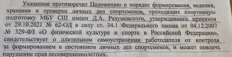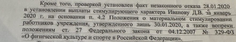Свои слова тренер подтверждает документами из прокуратуры, решениями суда, где Скобелина обязуют устранить выявленные нарушения, и личными документами из спортшколы (все они есть в распоряжении редакции). «Кстати, в настоящее время в следственном комитете ведется проверка по данным фактам, которые установлены и подтверждены прокуратурой Заволжского района. Это нарушение и трудового законодательства, и уставной деятельности школы», — добавил тренер.