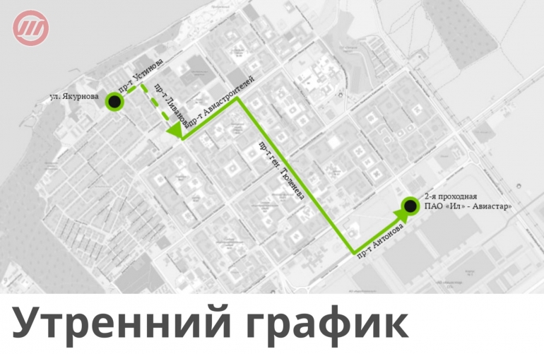 Маршрут: от перекрёстка проспекта Маршала Устинова и улицы Якурнова — по проспектам Устинова, Ливанова, Авиастроителей, Генерала Тюленева и Антонова — до 2-й проходной ПАО «Ил» (Авиастар).
