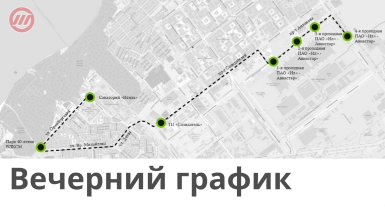 Маршрут: от 4-й проходной ПАО «Ил» (Авиастар) — по проезду А. Сысцова, проспектам Антонова, Генерала Тюленева, Созидателей, улицам Деева, Вр. Михайлова и Оренбургской — до санатория «Итиль».