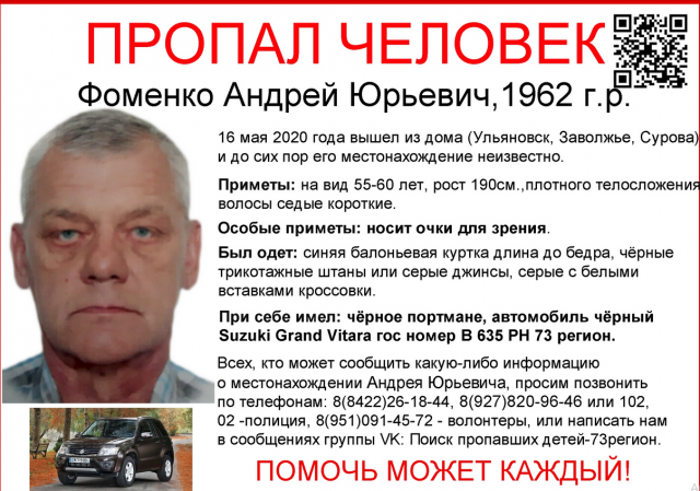 В Заволжском районе Ульяновска пропал 58-летний Андрей Фоменко. Он на своем автомобиле Suzuki уехал из дома 16 мая, и до сих пор его местонахождение неизвестно.