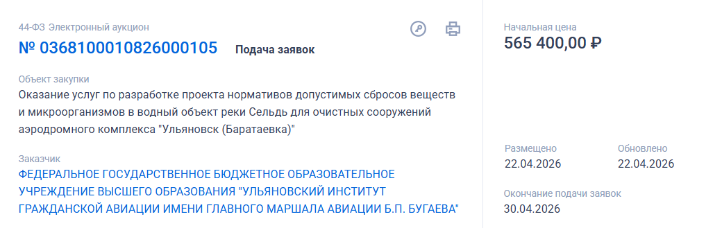Электронный аукцион размещен на портале ЕИС «Закупки» — подать заявку на разработку проекта нормативов допустимых сбросов веществ и микроорганизмов в водный объект реки Сельдь для очистных сооружений аэродромного комплекса «Ульяновск (Баратаевка)» подрядчики могут до 30 апреля включительно.