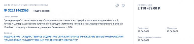 Аукцион размещен 10 июня на портале ЕИС "Закупки". В описании говорится, что предусматривается обследование состояния конструкций и материалов здания для разработки научно-проектной документации по реставрации и приспособлению объекта к современному использованию.