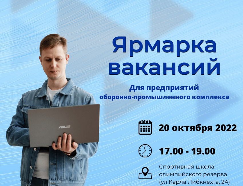 В Ульяновске пройдёт вторая ярмарка вакансий для предприятий оборонно-промышленного комплекса. Всех желающих найти работу в ОПК служба занятости ждёт 20 октября с 17:00 до 19:00 в спортивной школе олимпийского резерва по лёгкой атлетике (улиц Карла Либкнехта, 24).