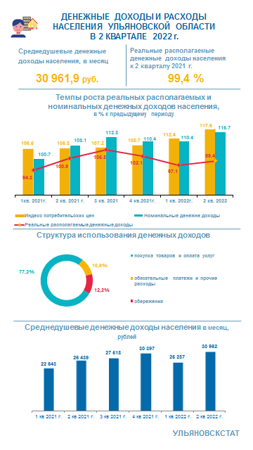 Основная часть дохода (77,2%) у жителей региона уходит на покупку товаров и оплату услуг. 10,6% доходов тратится на погашение кредитов и обязательные платежи. 12,2%% ульяновцы откладывают на будущее.