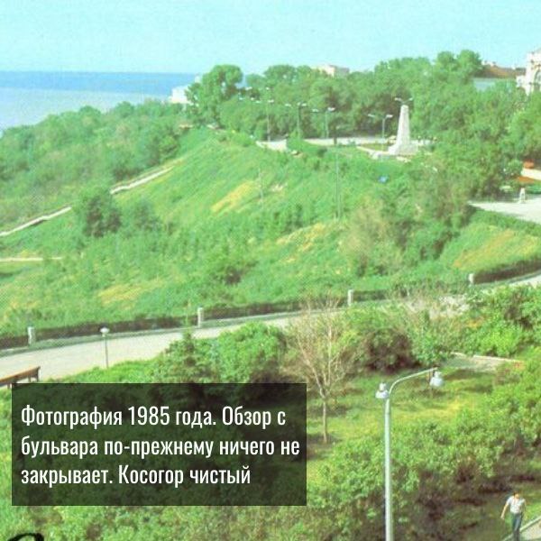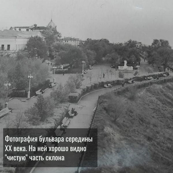 — В начале XX века город страдал от разрушительных оползней. Чтобы защитить Симбирск от стихии, косогор начали засаживать деревьями. Их корни вросли глубоко в почву и связали её. Это дало эффект: до середины 50-х годов разрушительных оползней не было. Однако никто не собирался засаживать косогор деревьями полностью. На фотографиях из 70-80-х хорошо видно, что самая верхняя часть склона лысая. Ничто на ней не мешает смотреть на Волгу. Правда, со временем её захватили американские клены и мелколистные вязы — растущие с бешеной скоростью сорняки, закрывшие обзор.