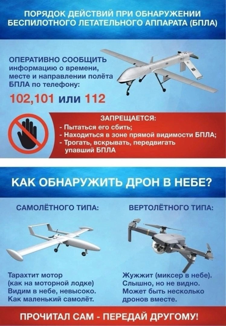 Так, в случае обнаружения в небе беспилотника необходимо оперативно сообщить полную информацию о месте, времени обнаружения, количестве и направлении движения беспилотного летательного аппарата по номеру 102,101 или 112.