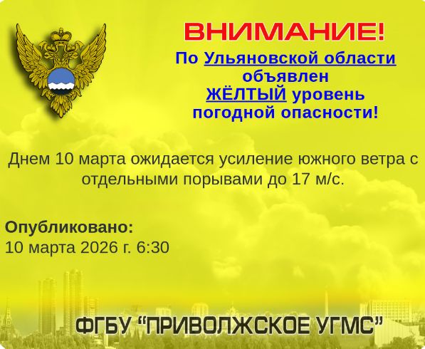 По данным Гидрометцентра, сегодня, днем, 10 марта, на территории Ульяновской области ожидается сильный южный ветер, его порывы будут достигать 17 метров в секунду.