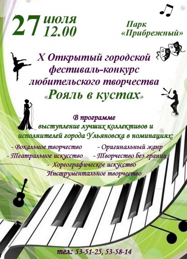 В Ульяновске в парке «Прибрежный» 27 июля состоится фестиваль-конкурс любительского творчества «Рояль в кустах». Начнется фестиваль в 12.00.