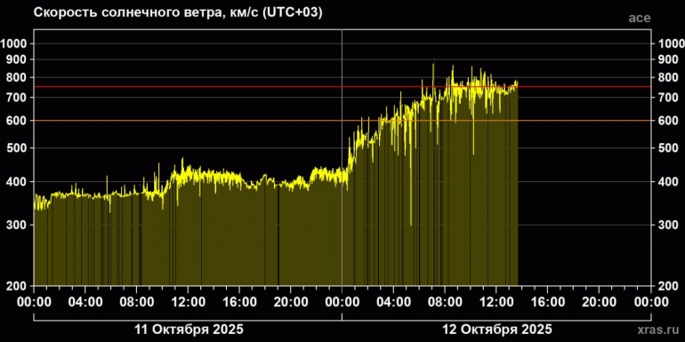 - Планета уже внутри потока плазмы из корональной дыры. Красная линия — это отсечка, отделяющая очень высокие скорости солнечного ветра от экстремально высоких, поэтому дует хорошо. Исходя из того, как всё складывается, сегодня будет ещё 2 оповещения. В течение 3-4 часов — про начавшиеся магнитные бури, и ближе к темному времени суток в центральной части страны — про полярные сияния. Неожиданно, кстати. Расчет показывал на завтра, - сообщили ученые.