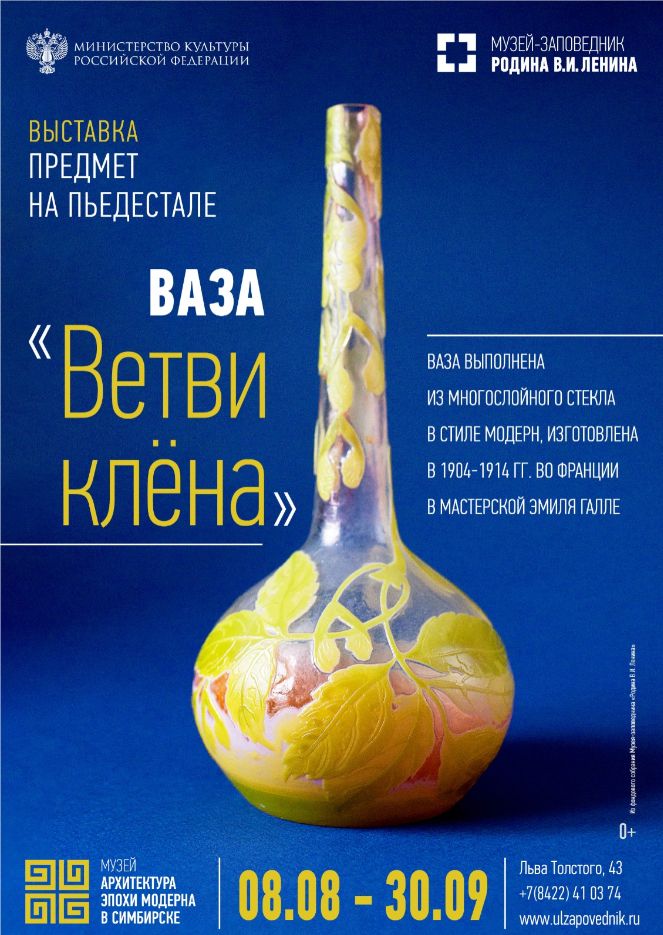 Вчера, 7 августа, в Ульяновске состоялось открытие выставки «Предмет на пьедестале: Ваза «Ветви клёна». Посетить её можно в музее «Архитектура эпохи модерна в Симбирске», который находится на улице льва Толстого, 43.