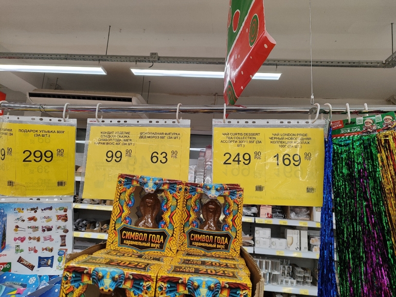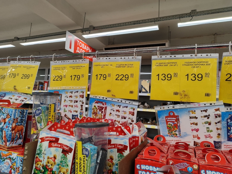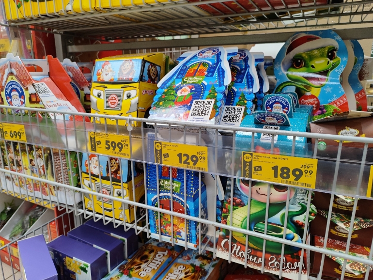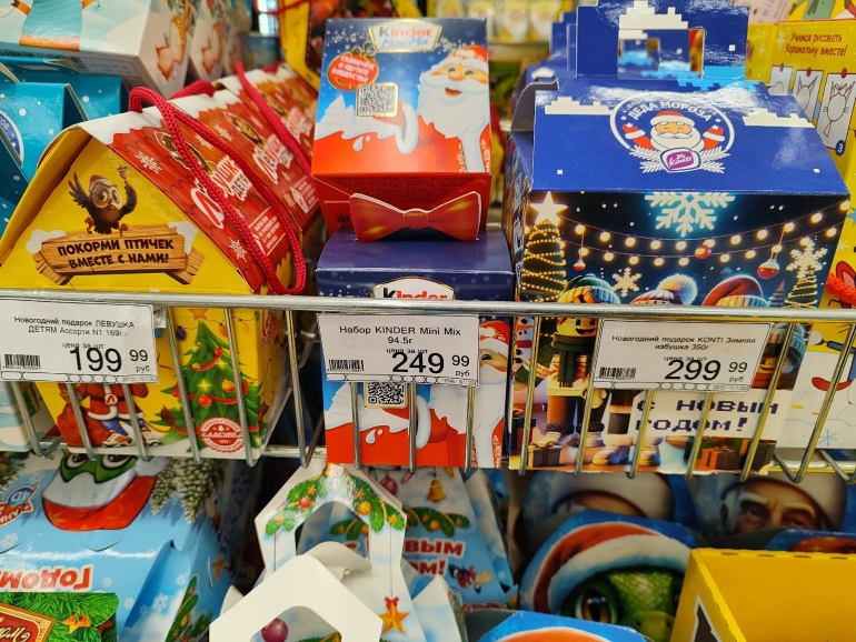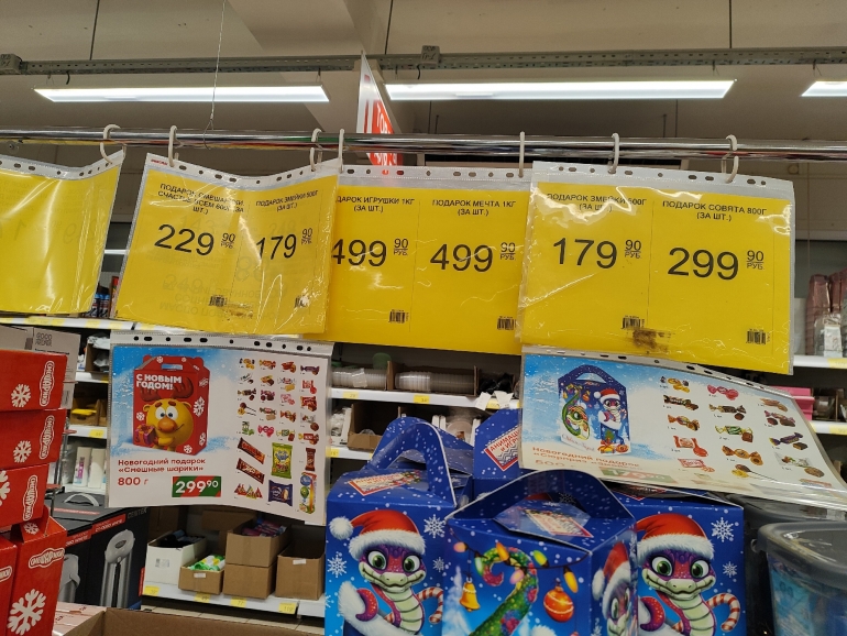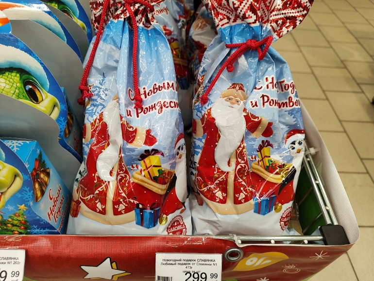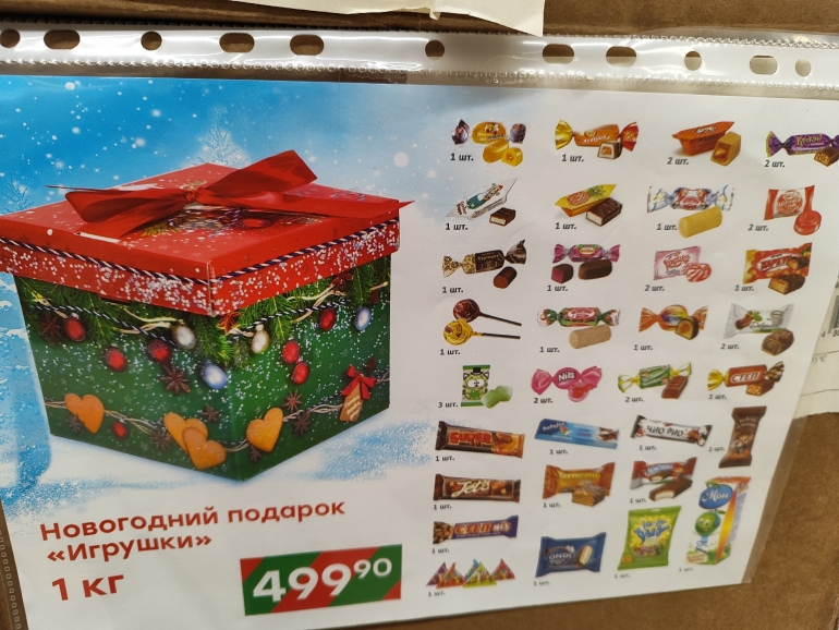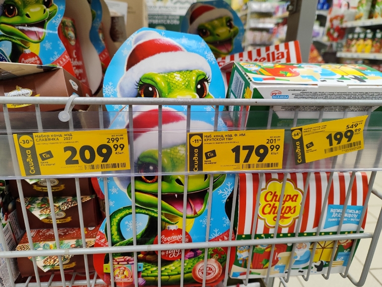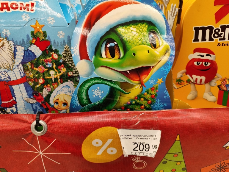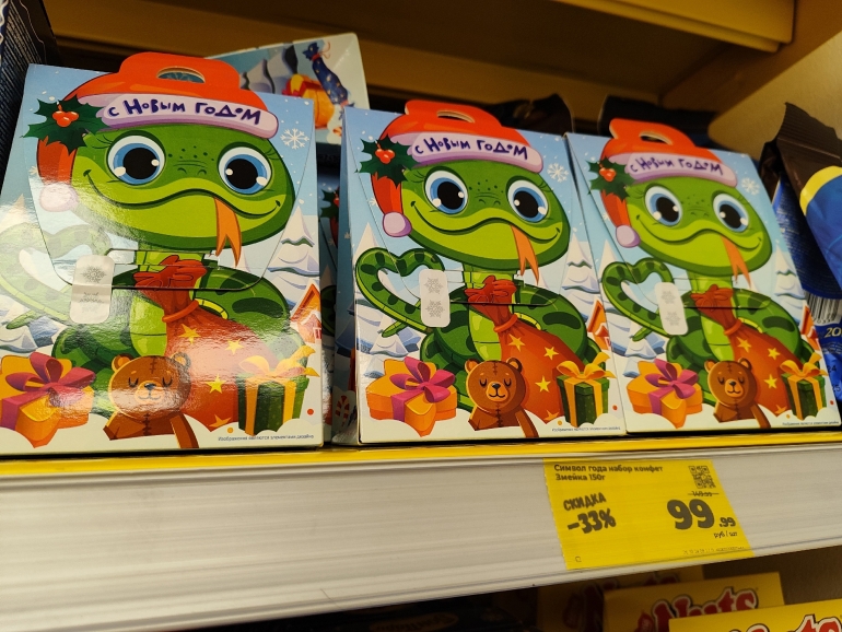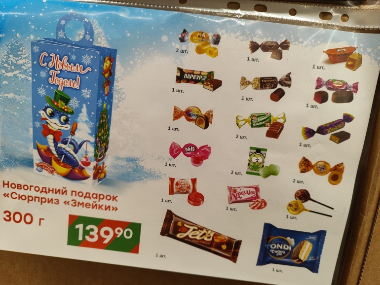 Большое разнообразие журналист нашёл в «Победе». Закупка от одного поставщика — все наборы собраны ООО «Сластёныч» из Татарстана. Есть информация о составе коробок, цене и весе: 60-граммовый шоколадный «Дед Мороз» стоит 63,90 руб.; карамельную змею продают за 99,90 руб./ 40 г; 500-граммовая коробка «Сюрприз «Змейки» стоит 179,90 (18 позиций), а 300-граммовая — 139,90; килограммовая коробка с 30 позициями — 499,90.