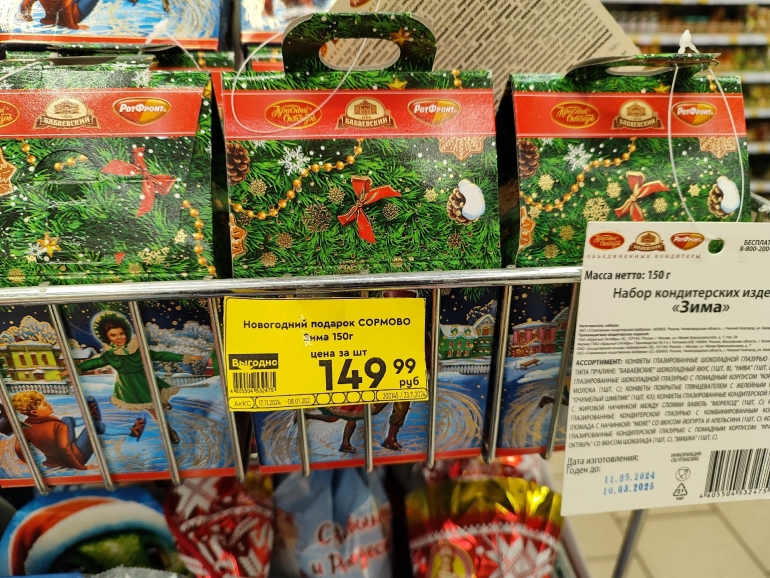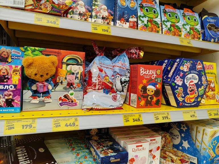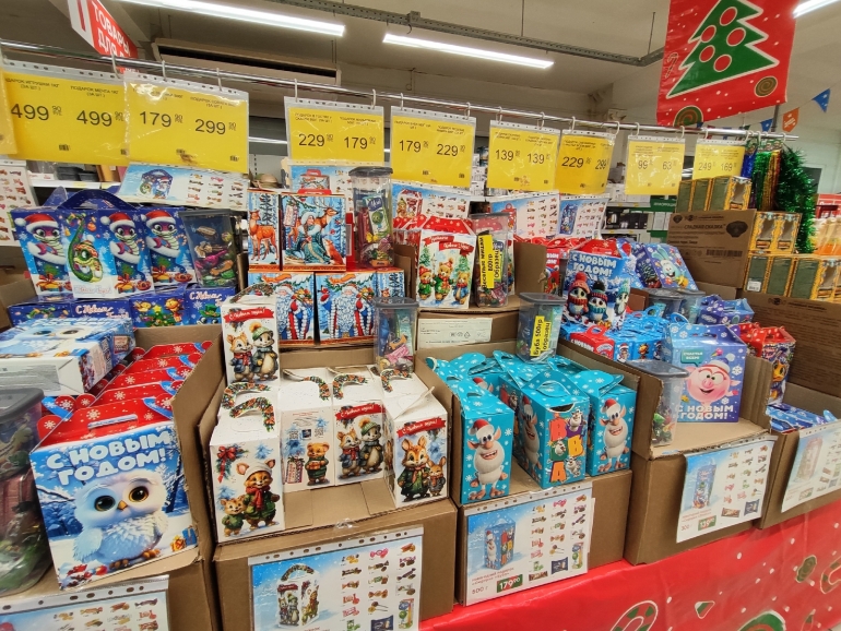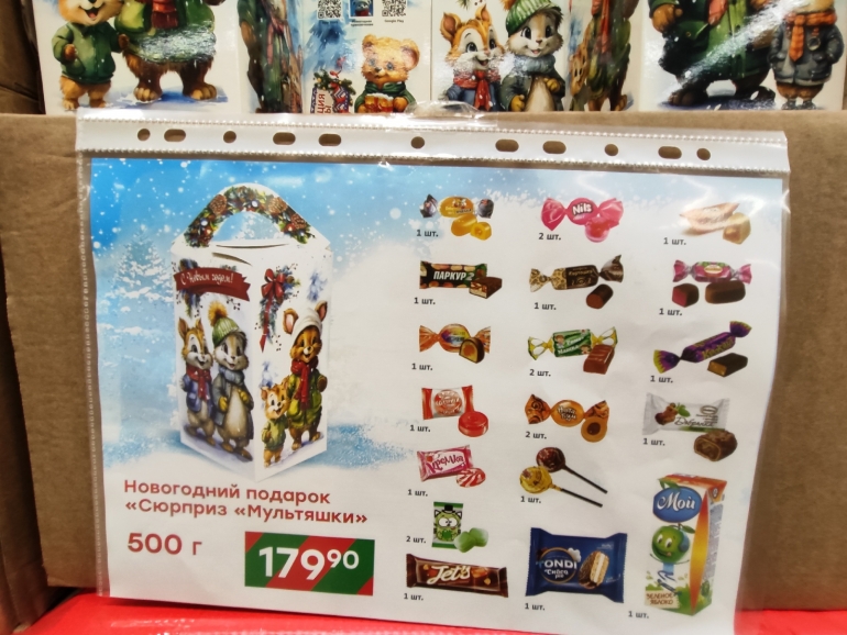 Эксперт группы корпоративных рейтингов АКРА Антон Тренин в беседе с агентством РИА «Новости» отметил, что в октябре новогодний сладкий набор весом 500 г, который чаще всего дарят детям, за год подорожал на 11 % до 389 рублей. В составе: по 150 г натуральных шоколадных конфет и зефира, по 100 г шоколада и мягких глазированных конфет, 50 г карамели.