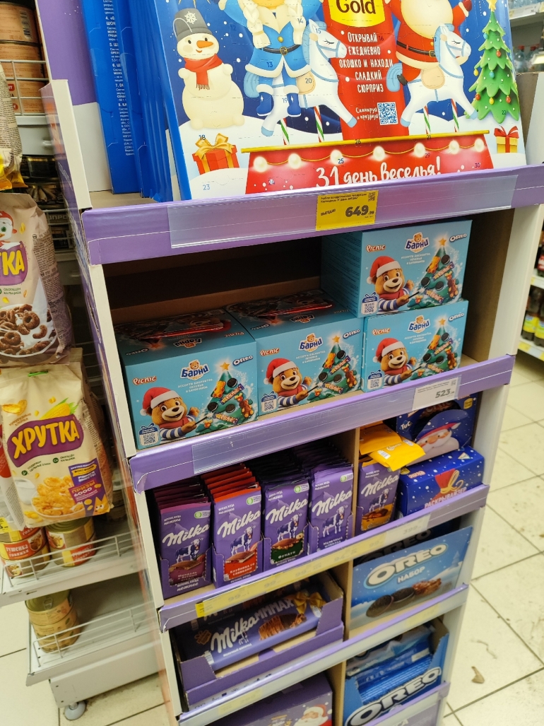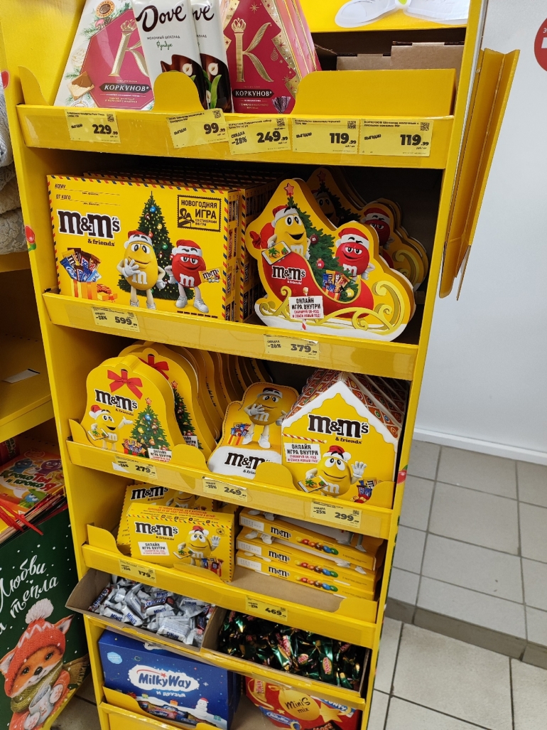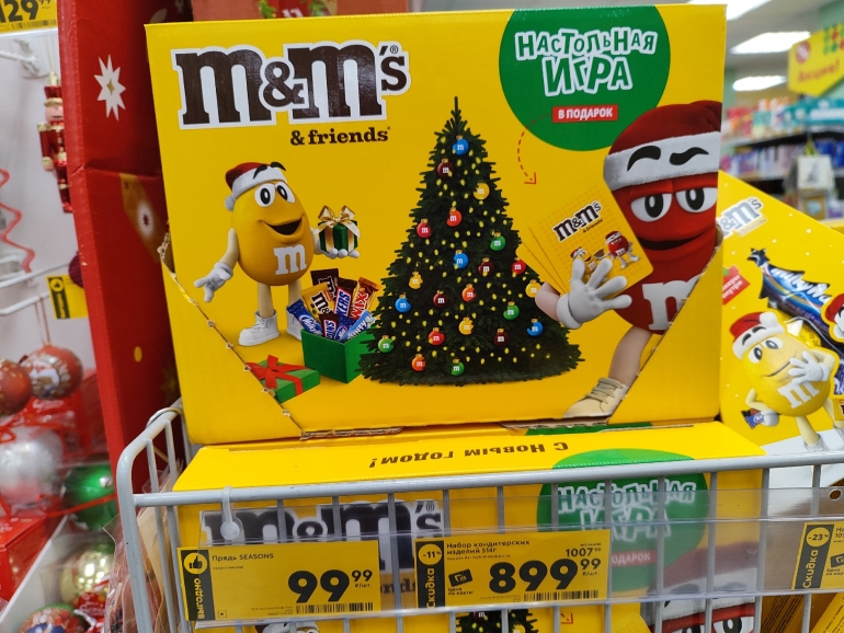 В «Маните» несколько отдельных стеллажей отведены под бренды: M&M's («Камин» — 469,99 руб/ 394 г; «Посылка» — 179,99 руб./ 150 г; «Колокольчик» — 279,99 руб./ 168 г; «Имбирный дом» — 299,99 руб./ 215 г); Milka (Party mix — 399,99 руб./ 373 г; «Портфель» — 419,99 руб./ 398 г). Из доступных — нам попался набор за 99,99 руб/ 150 г. Остальные цены на фото.