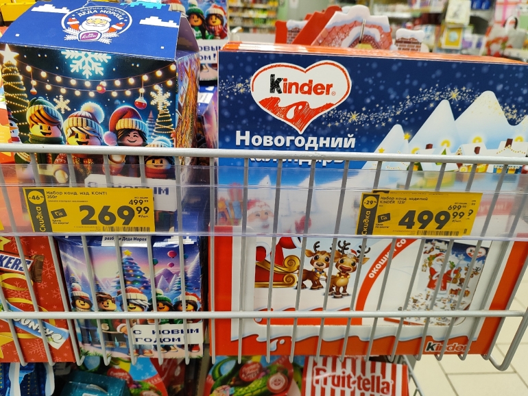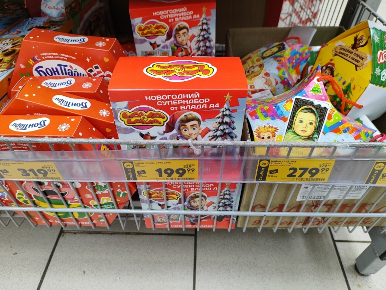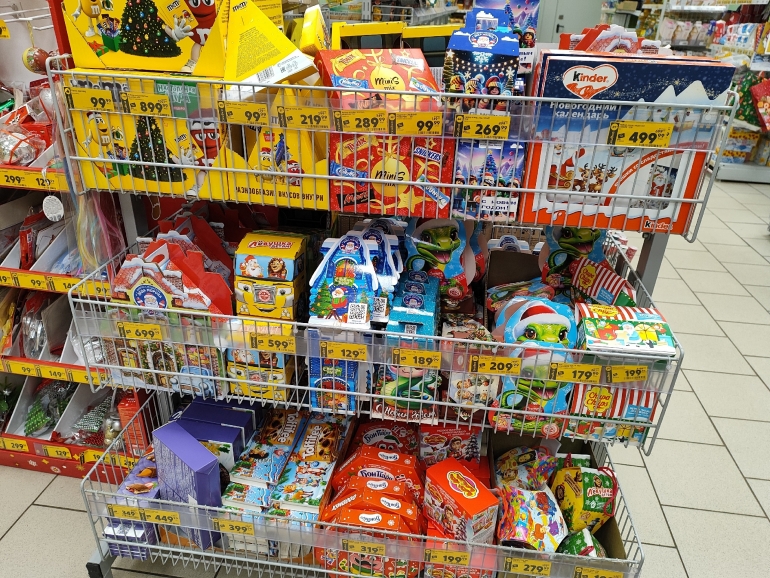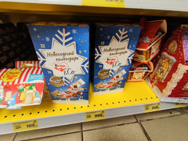 «Пятерочка» сделала ставку на известные бренды — Kinder (набор весом 123 г — 499,99 руб.); M&M's (набор весом 514 г — 899,99); Бон Пари (набор весом 364,5 г — 319,99 руб.); «Аленка» (набор в виде звезды и весом 185 г — 279,99). Из более доступного — за 129,99 набор весом 150 г от компании Konti.