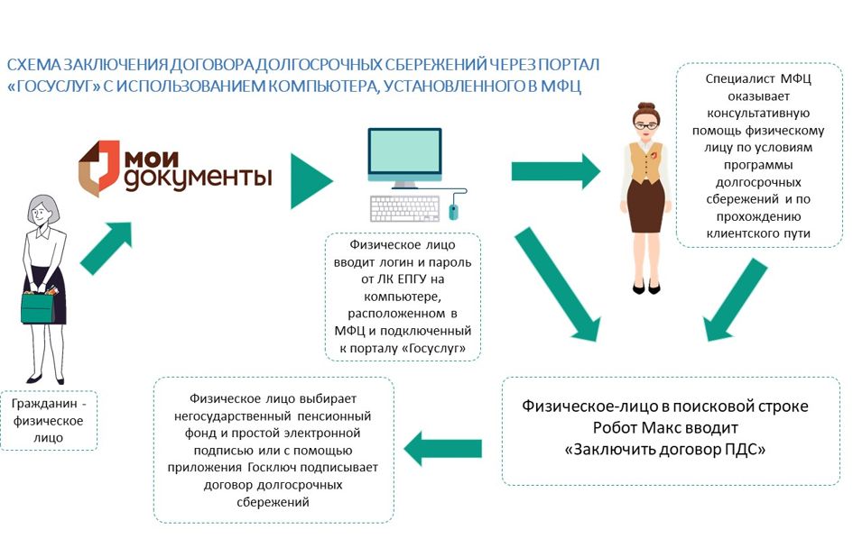 Заключить договор долгосрочных сбережений можно через портал Госуслуг в секторе пользовательского сопровождения МФЦ. Для этого нужно авторизоваться на портале, а потом в поисковой строке Робота Макса ввести «Заключить договор ПДС».