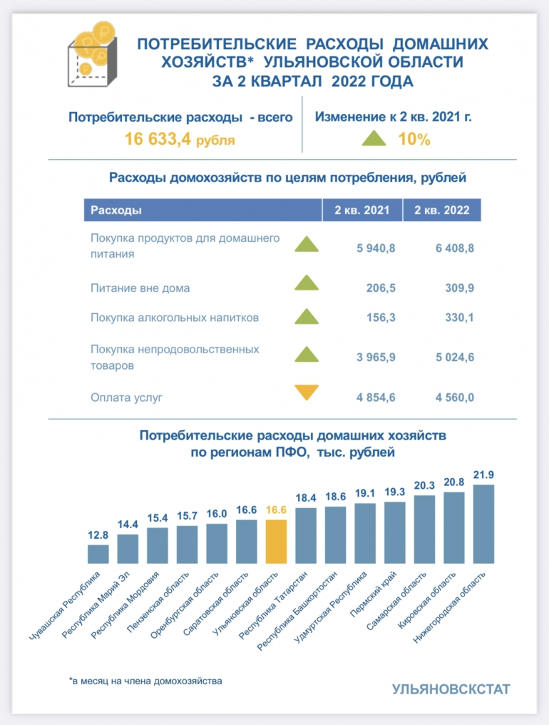 Ульяновскстат опубликовал сведения о потребительских расходах домашних хозяйств. За год этот показатель вырос на 10%.