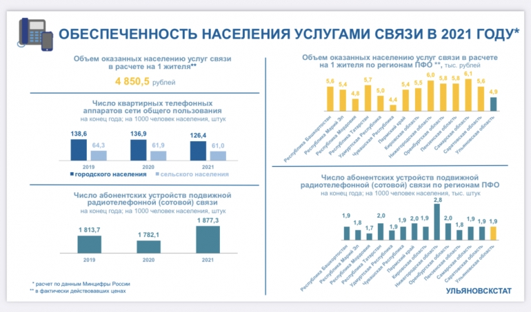 Несмотря на развитие технологий ульяновцы все ещё используют стационарные телефоны. По данным на 2021 год, телефонный аппарат есть у 126 горожан и у 61 жителя села из тысячи.