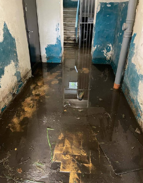 После каждого ливня в многоэтажке на Можайского, 17 заливает подъезд и офис, расположенный на первом этаже.