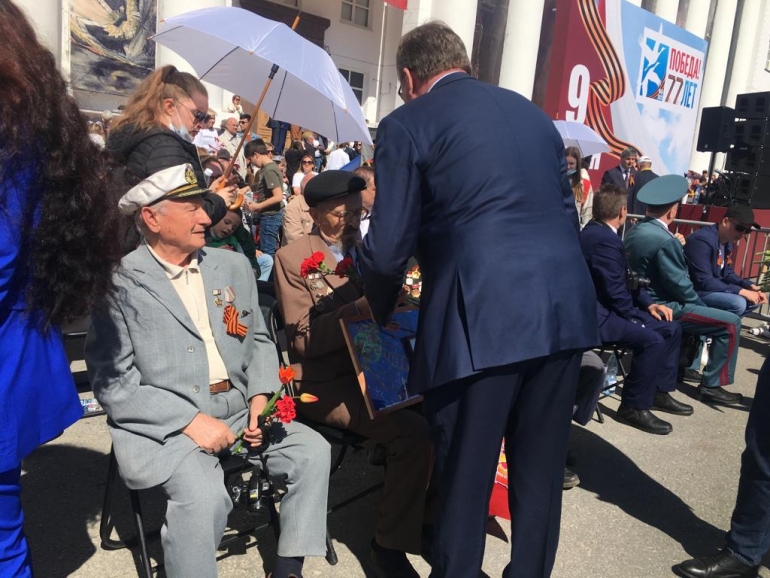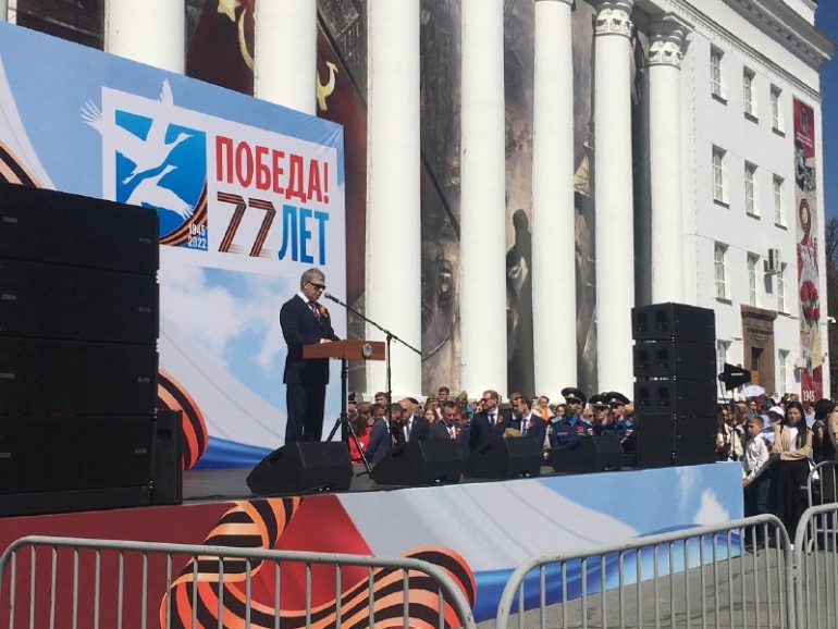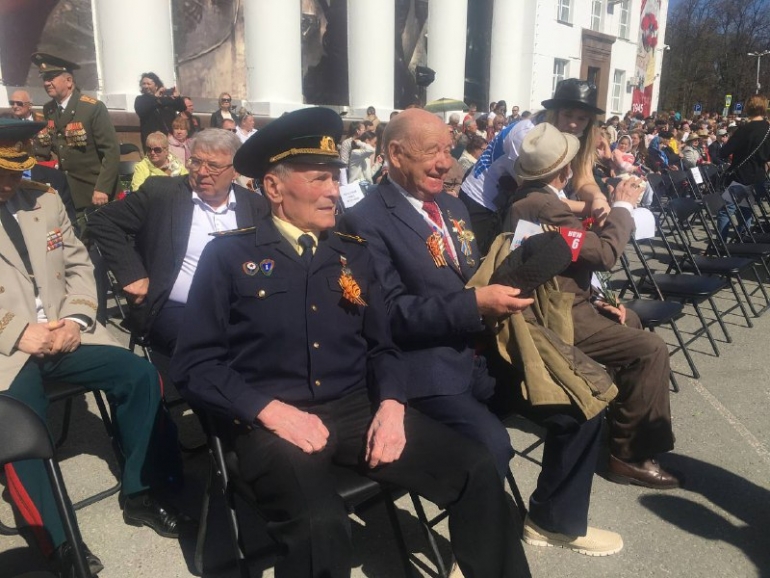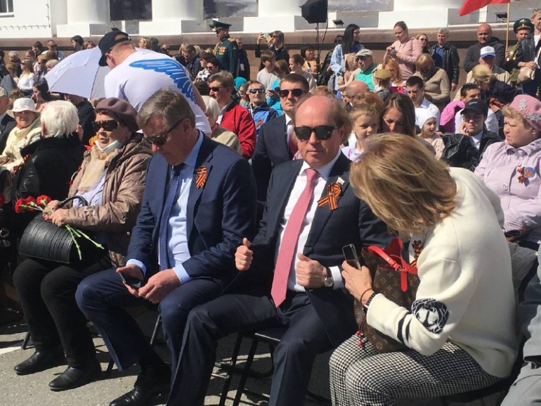 В числе гостей, которые пришли на парад, были сенатор Сергей Рябухин, депутата Госдумы Владимир Кононов, зампред регионального заксобрания Василий Гвоздев. Почетные места разделили на две части: слева от сцены усадили депутатав городского и областного парламента и столичных гостей, справа - ветеранов, военных, детей войны.