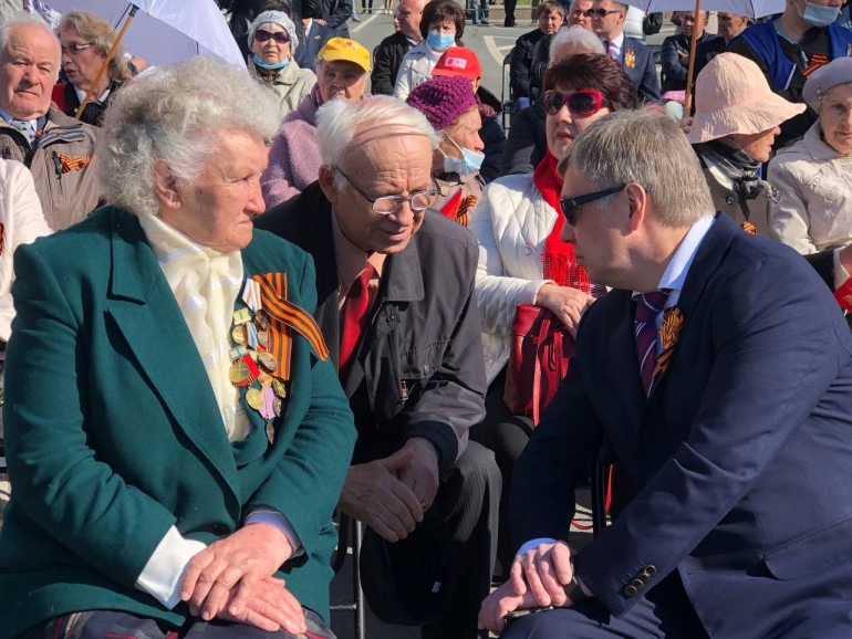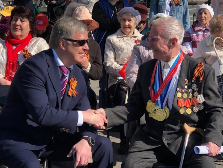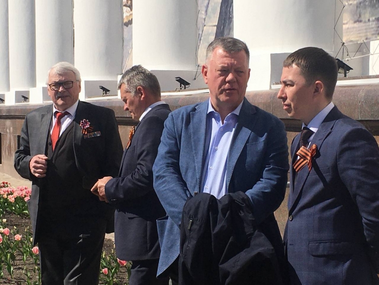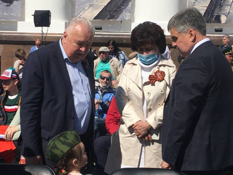 Позади него - бывший министр строительства Ульяновской области Михаил Шканов. Прибыв на площадь, он обнимался с ветеранами, фотографировался с ними на память.