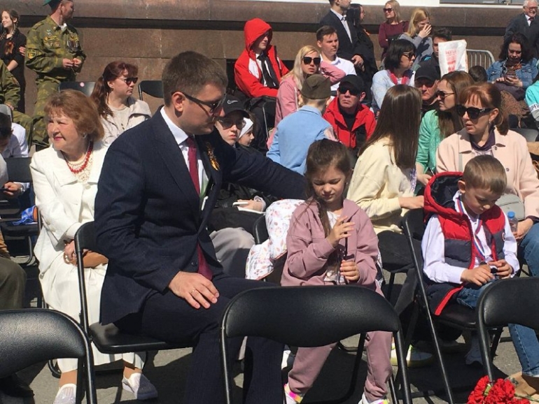 Председатель Гордумы Илья Ножечкин пришел на парад с дочкой и сыном.