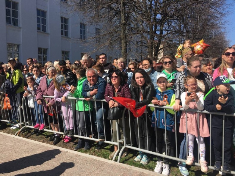 Гостей на центральной площади все больше. Люди соскучились по крупным городским мероприятиям. По дороге к Соборной многие покупали пилотки и шарики, завязывали на груди Георгиевские ленточки. Очень много семей, родителей с детьми, в том числе, в колясках.